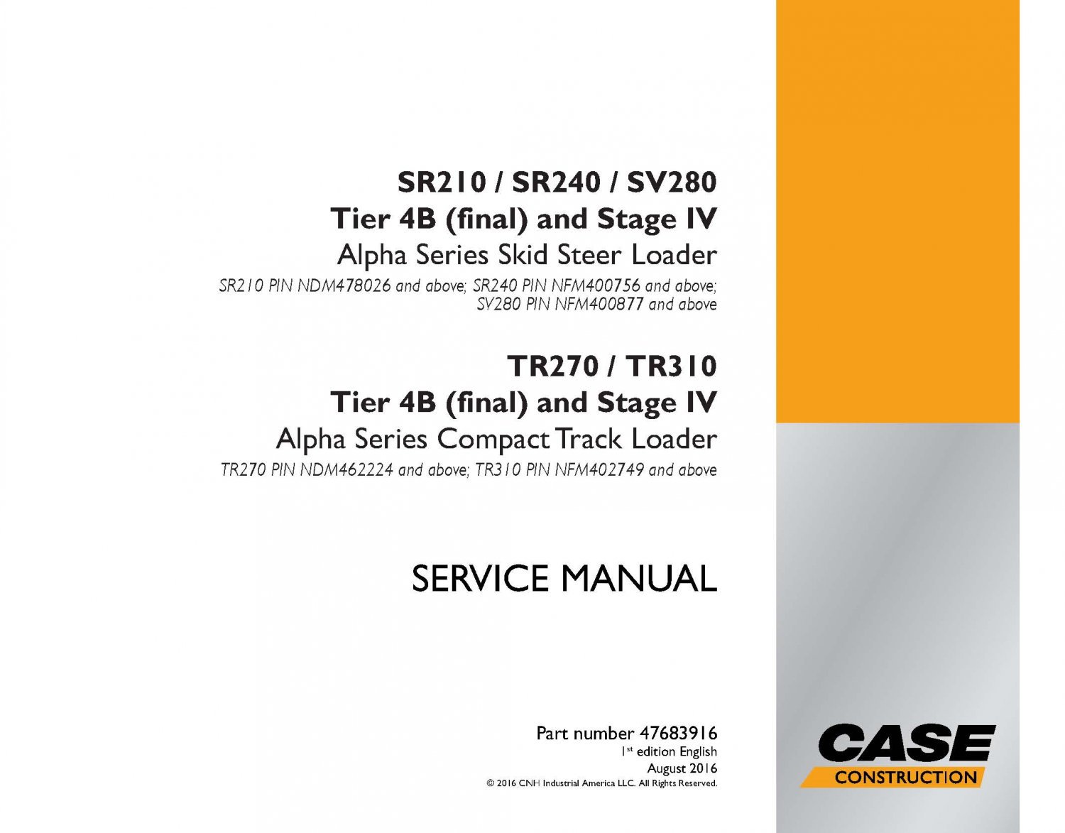 This is a Case SR210, SR240, SV280, TR270, TR310 tier 4B LOADER SERVICE REPAIR MANUAL