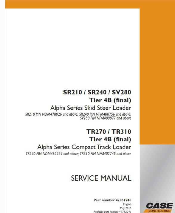 This is a Case SR210, SR240, SV280, TR270, TR310 tier 4B LOADER SERVICE REPAIR MANUAL